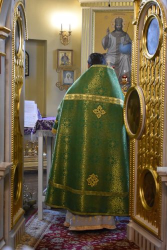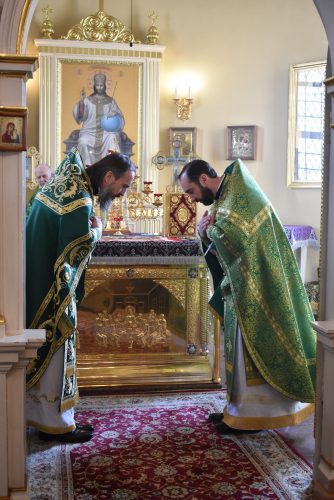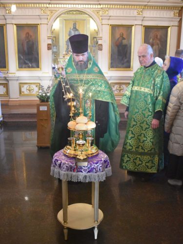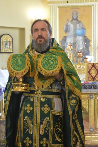 Позднюю Божественную Литургию совершил настоятель храма протоиерей Вячеслав Вабищевич, в сослужении клирика храма иерея Димитрия Власенко.