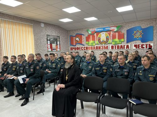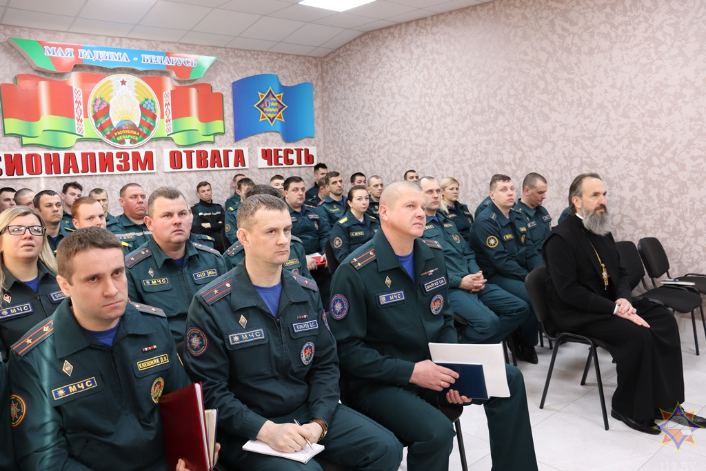 Протоиерей Вячеслав напомнил собравшимся, что человек имеет не только тело, о котором каждый должен заботиться, особенно сотрудники отдела по чрезвычайным ситуациям, потому что от них иногда зависят жизни других людей, но и душу, о которой нужно заботится никак не меньше чем о теле. Напомнил о важности любви в жизни человека к Богу, Родине и семье, которая каждого ждёт дома. Так же поговорили о добродетелях без которых не может быть настоящего спасателя — жертвенность, мужество, честь.