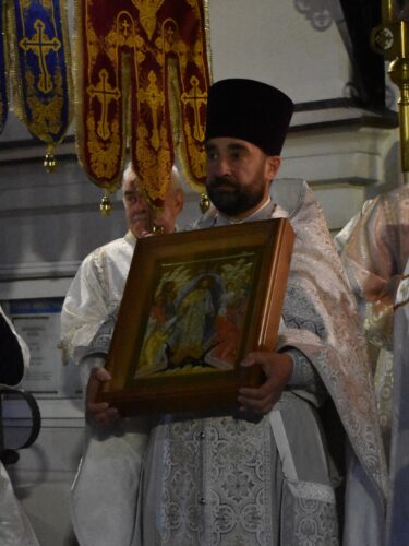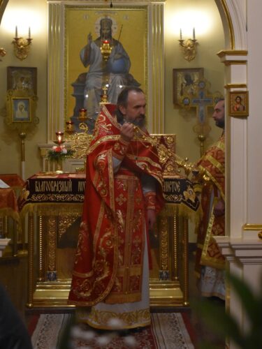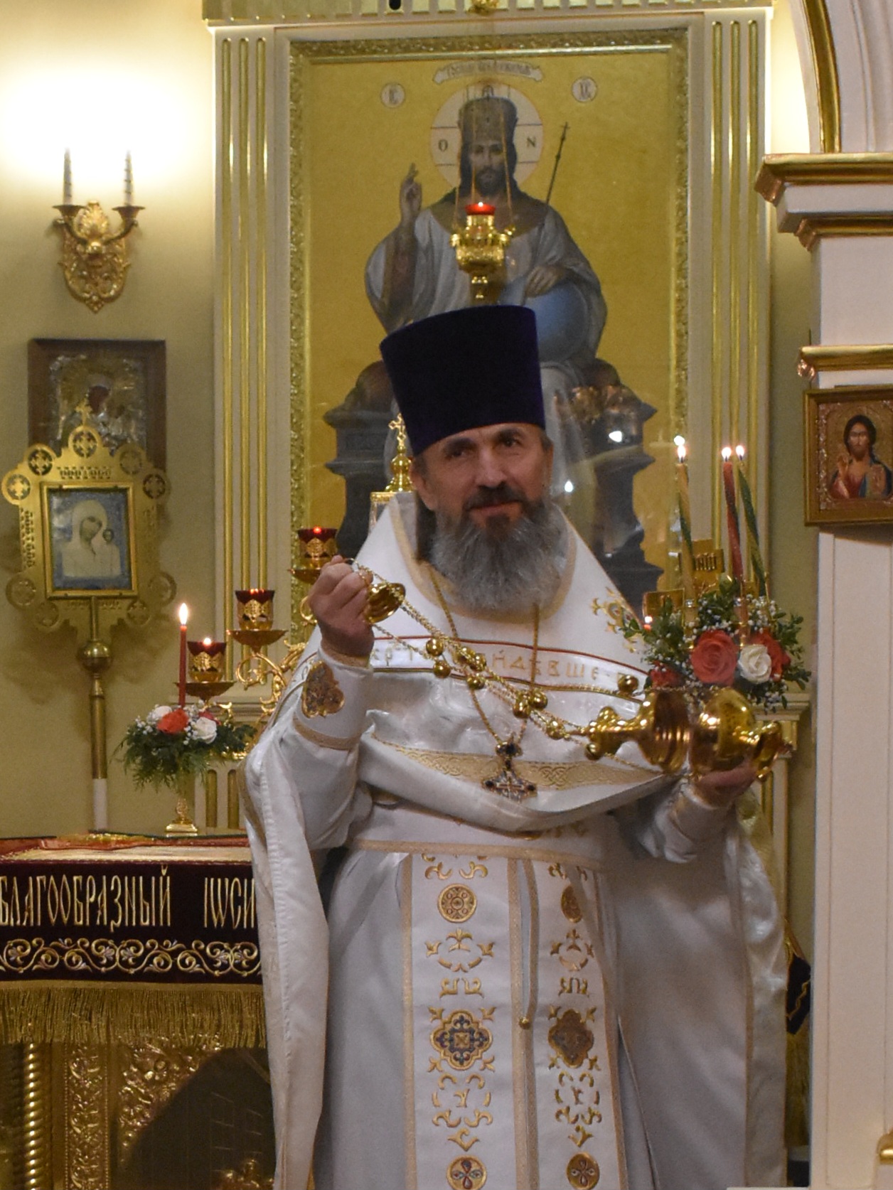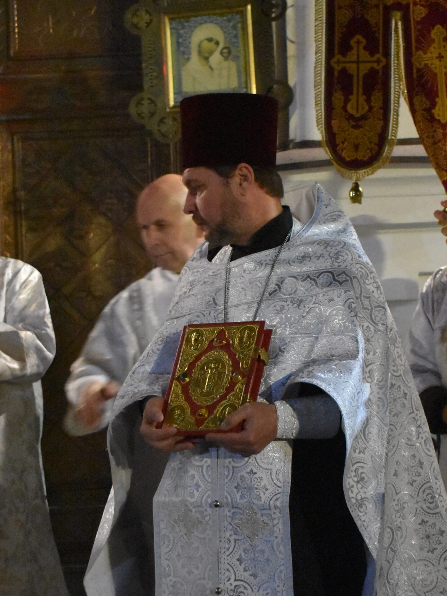 После пения стихир Пасхи протоиерей Вячеслав произнес Слово огласительное святителя Иоанна Златоуста на Святую Пасху.