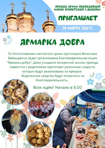 29 марта 2026 года в приходе храма преподобной Марии Египетской г.Вилейка, по благословению настоятеля храма протоиерея Вячеслава Вабищевича, прошла благотворительная акция «Ярмарка добра». Дома учащиеся воскресной школы прихода совместно с родителями приготовили различные сладости, которые были реализованы на ярмарке. Вырученные средства будут потрачены на благотворительность (подарки нуждающимся к празднику Воскресения Христова).
